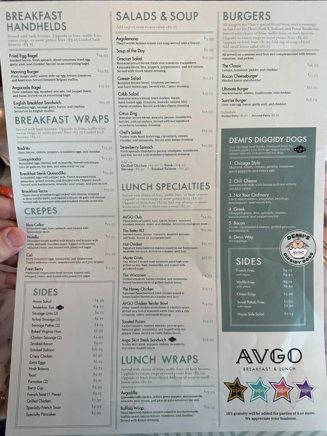 Avgo is great!  I do not have any real critiques.  The food is always great, consistently prepared well, portions are huge (we always take leftovers home), and pricing is fair.  On Sundays there is usually the after-church rush, and you will sometimes need to wait for a table, but the wait is usually pretty short.  The vibe is casual – you could wear sweats and not feel out of place, and the median outfit would be jeans and a nice shirt.  The restauarant is also family friendly, so if you have little ones that need to get the wiggles out, kids could walk around the table and not get funny looks.